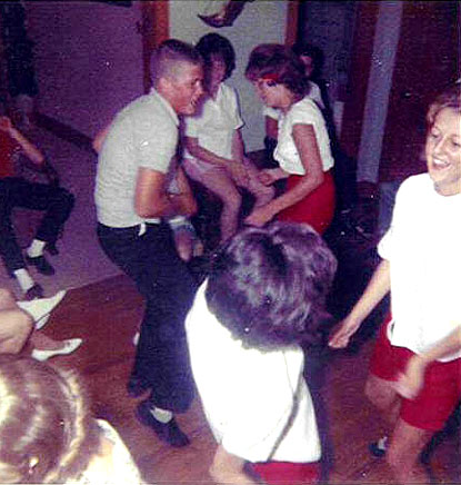 Carolyn Burgess Featheringill, Class of '65 - Looks like we're going to have to work together to fill in the blanks for the picture of the dancers. I'm certain that the girl in the foreground is Cherry Nance '65 and the girl in the background is Judy Adair '65. Remembering a story in the Traveller some time back, I'm guessing that the party took place at Judy's home in the summer of '61 or '62.